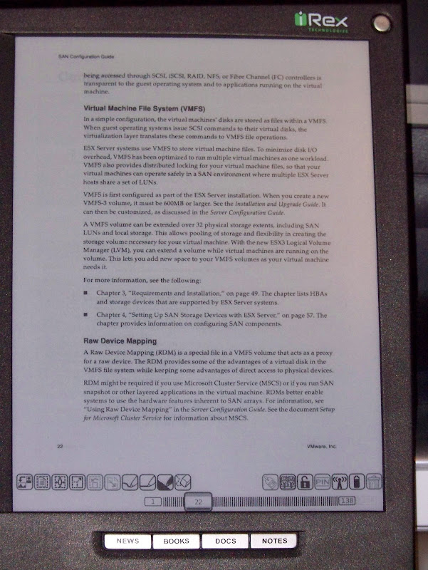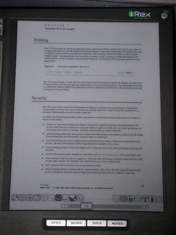 I also have the photography skills of an untrain monkey, so bear with me. ;) http://lh3.google.com/adamrb/RrZXXHj...00/6.00003.jpg http://lh6.google.com/adamrb/RrZXW3j...00/4.00004.jpg http://lh4.google.com/adamrb/RrZXWXj...00/3.00006.jpg http://lh3.google.com/adamrb/RrZXWHj...00/1.00012.jpg Both documents are very readable in both modes. Full screen especially makes the second look great (after zooming to crop the margins). |