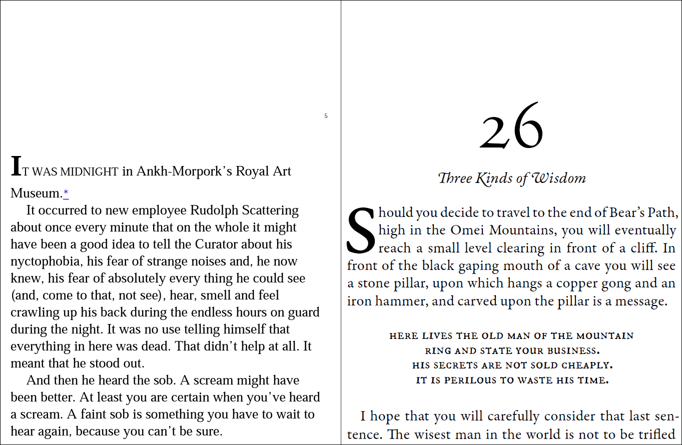 Even so, there are many here who would much prefer the page on the left in my picture to the page on the right. Some of those people would choose it just to be contrary, while others have developed a taste for narrower fonts or a denser (blacker) text block. Others still have become accustomed to the rather primitive styles of most ebooks and find more advanced things to be gaudy and distracting.