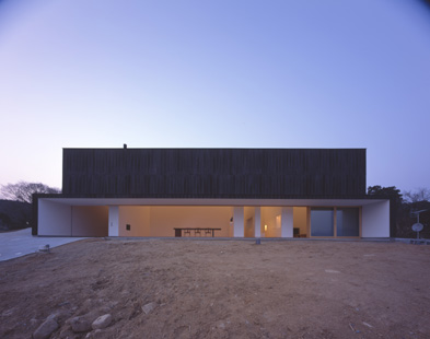 The facade is burned cedar (literally burned cedar, with the resulting loose coal and ash brushed off, rinsed with water and then oiled with linseed oil).