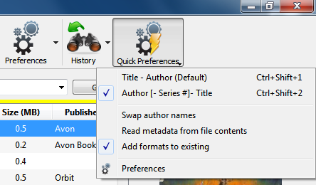 This plugin provides a way to quickly switch between certain preferences values without going into the preferences dialog. Specifically it currently caters for preferences related to adding books but could be added to in future if needed. This gives you a toolbar button (see screenshot below) which allows you to: