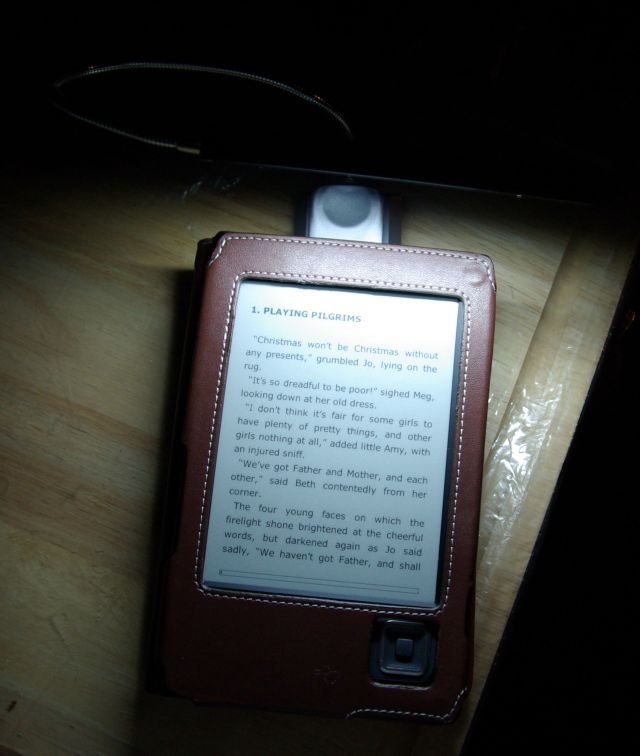 Here's several pictures. The contrast between the light level nearest the bulb and further away is rather exaggerated by the camera, unfortunately. The brightness across the screen is really much more even than the camera causes it to appear in the first picture in particular. The last picture is just to give an idea of exactly what the light looks like and how far the gooseneck can be extended (in contrast to the in-use photos, where the gooseneck is bent to bring the light as close to the Cybook as possible, in order to reduce light leakage to the surrounding area, as one would prefer when trying not to disturb one's companion).