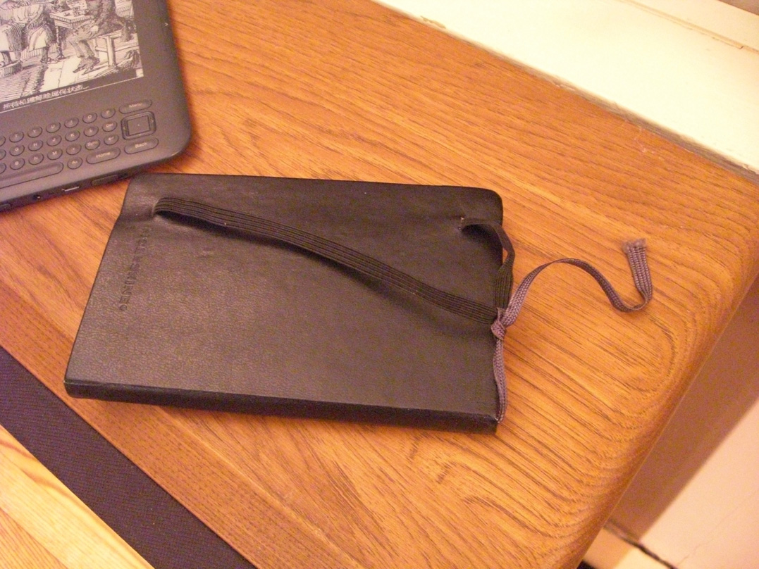 1. Place your Kindle inside the elastic of the Moleskine such that the elastic is only around the Kindle (the backs of the Moleskine and Kindle should be touching) and the binding of the Moleskine is facing down. Rotate the Moleskine to be perpendicular to the Kindle such that the binding is facing away from the Kindle and the edges of the pages are touching the Kindle. If the elastic is taught, continue to the next step. Otherwise tighten the elastic, as described below, before continuing.