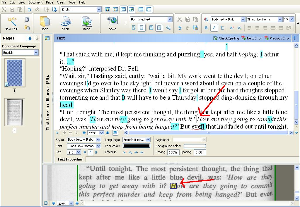 - Read through the recognized text and compare it with the source image in ABBYYs proofreader. I read through the entire book this way. Correcting errors, inserting marks for later search and replace (ABBYY does not support curly quotations, so I add an asterix to mark which quotation is left and right, "quotation text" => *"quotation text"*, and later search and replace *" and "* with appropriate quotation). I know that this can be done with regex afterwards, but I feel more in control over the quotation marks this way