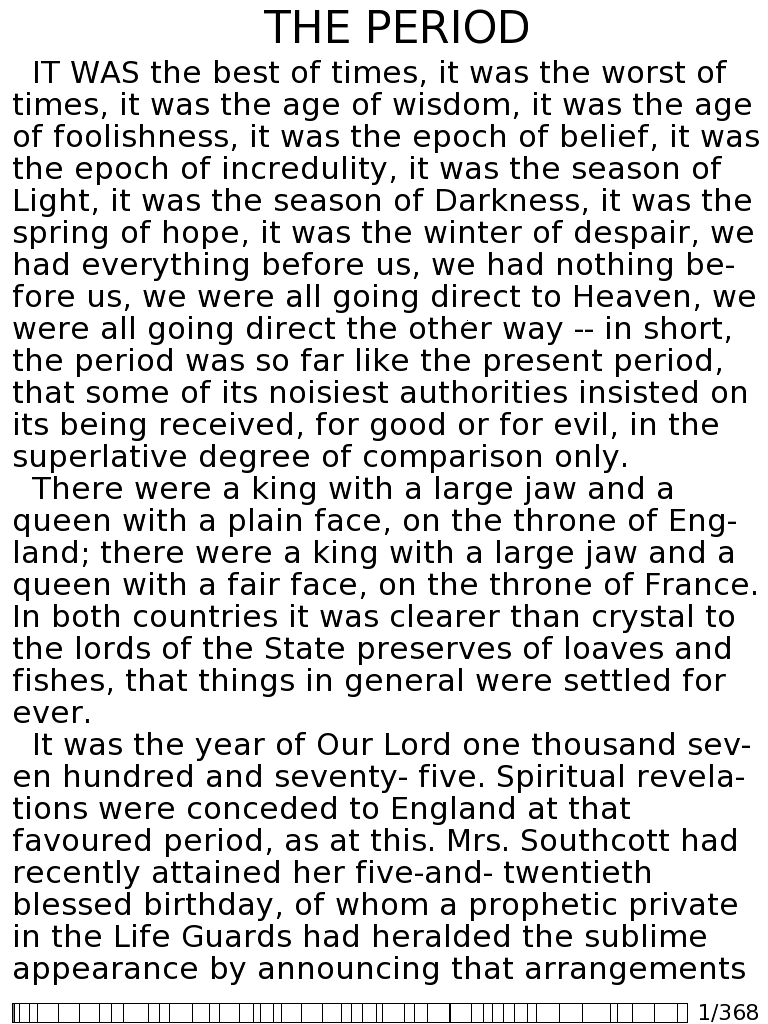 The screenshots show the original setup and the setup provided by the example ui.xml (as usual, you may have to click twice for your browser to display full sized images). I increased the default font size, added left justification and auto hypenation, removed the clock, and made the indicator at the bottom bigger. EDIT: minor change to make the progress bar taller now included. If it were any taller, one line of text would be lost.