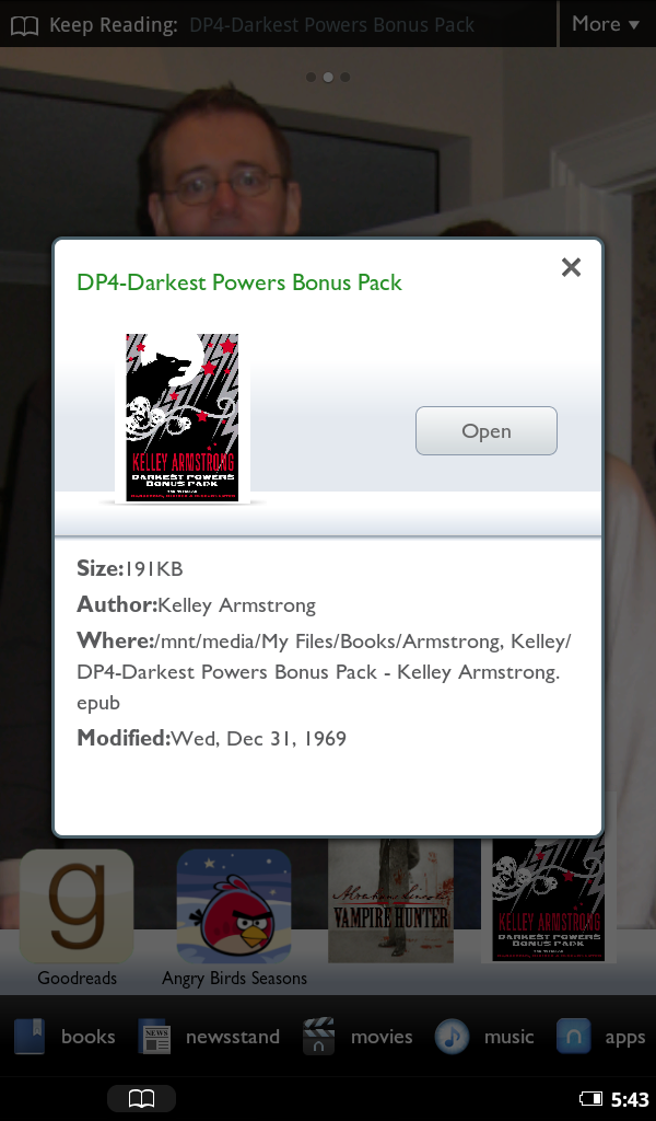 When I had my first loaded my books onto my device. I organized them and started to read my book. When I got to reading my second book on the device, I opened it and started to read it. When it was time to shut it off, I turned it off completely. When I went back to same book later in day. I got this error when I opened up my book. It said " Synchronizing reading location? On this device you are currently at page 1. On another device you are at page 15. Where would you like to start?" So I clicked the one that says the one I left on another device. The weirdest part is I haven't been reading it on another device. But when I held down on the book cover, it would open properly. So I contacted Nook customer service online chat on February 2/2012. They went through a couple of opinions. Then they decided that I should reset my Nook to get it to work again. When I did that I added the same book, it worked fine and my device was fine for awhile.