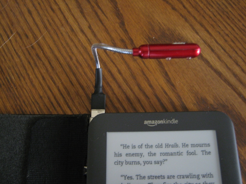 I thought I'd share my efforts to create a lit cover for my Kindle Keyboard. I tried a few different ways using brass tubing etc. with the light hinged but ended up with a much simpler removable light. A trip to 'The Source' (radio Shack in the US) produced a USB powered LED lamp on a flexible neck. They have 2 versions. One with 5 LED's and one with 2. The 2 LED version is even too bright at times so I opted for that one. What inspired me to use these lamps was the sale price of $2.95!