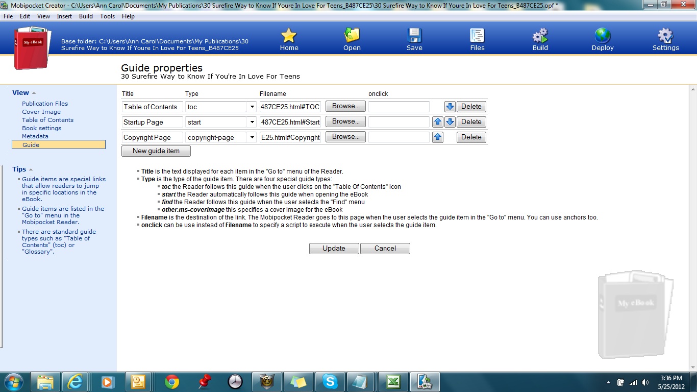 Nothing happens when I click Update and if I leave the page and go back, all the information I input is gone. I haven't published a book for several months and I noticed that now there is a number appended to the file when I upload to MBPC (in this case it's _B487CE25) which didn't used to happen. Also, when I went ahead and did a Build, there was no Guide data in the .opf file.