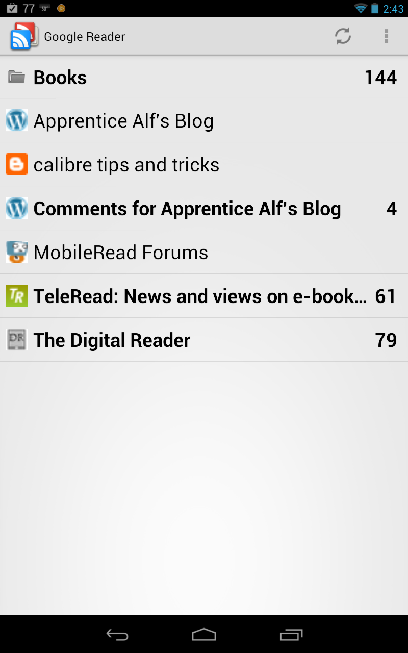 Update: Now that I have an Android device I no longer use any of calibre's recipes for gathering articles or news. I use Google Reader and its app to access blogs, web sites and newspapers of interest to me, see attached for examples of Google reader app.