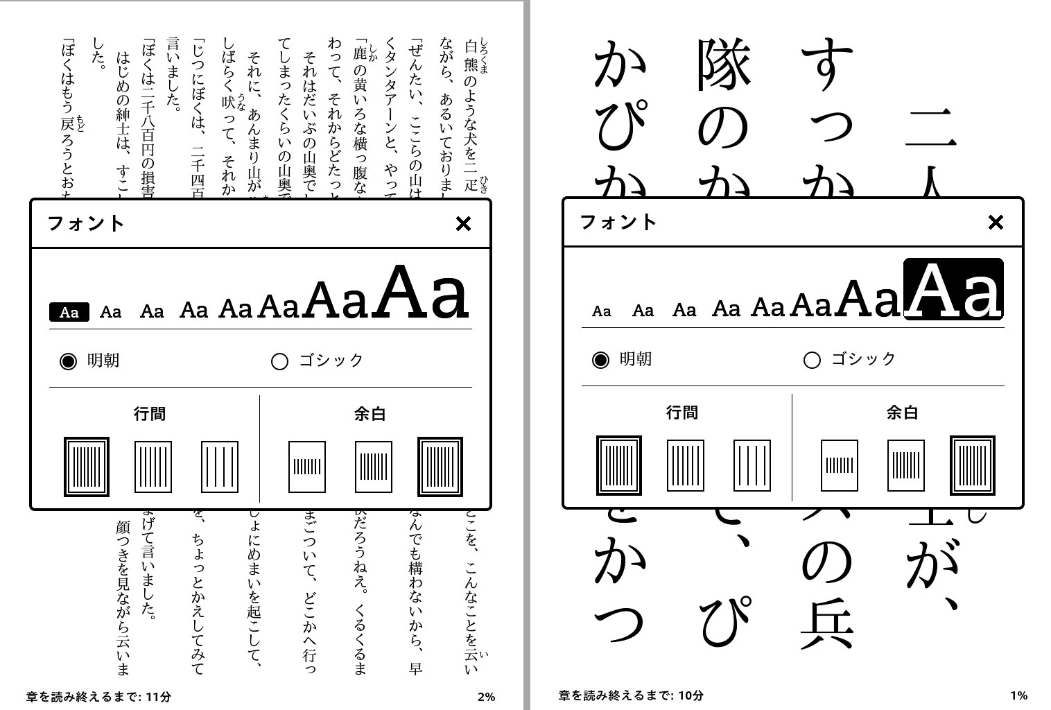 For Japanese books there are 2 font choices, one kaku-gothic (think the equivalent of sans-serif) and one minchou (think serif). Interestingly enough, when you open an English book, you instead get the 6 fonts that non-Japanese PWs have. I'm impressed! (My Japanese PRS-T1 has one font. One. Not impressed, Sony!)