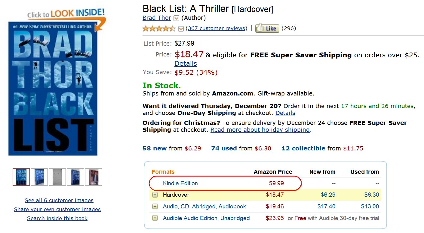 Black List by Brad Thor is $9.99 at Kindle according to Get books, but if you go to Kindle, it is $19.03.