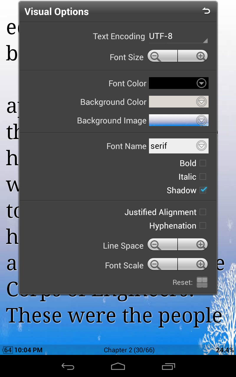 I experimented with a few of the themes first trying some dark backgrounds with various levels of blue or gray font colors, but I finally settled on using the Nature theme (I was surprised that this theme worked best for me) with the Shadow option checked and fonts that were scaled large enough for comfortable viewing. I also dropped the brightness down to 1%, but now that Moon+Reader allows levels below the minimum I usually read with the Nexus set to -12%.