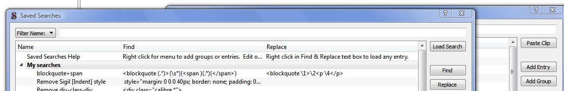The Saved Searches editor uses Right Click to add Groups and Entries, while the Clips editor has [Add Group] and [Add Entry] buttons