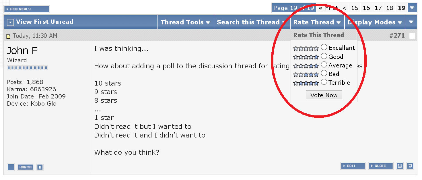 How about adding a poll to the discussion thread for rating the book? 12 choices...