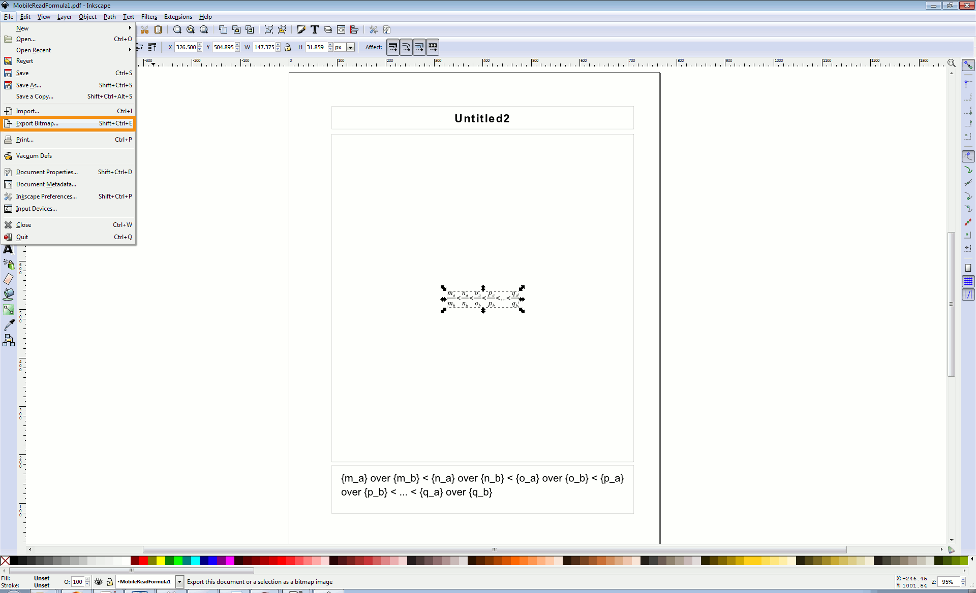 When you open Inkscape, you should be greeted with a blank screen. Press File - Open. Go to where you saved your LibreOffice Math PDF files, and open the first one: