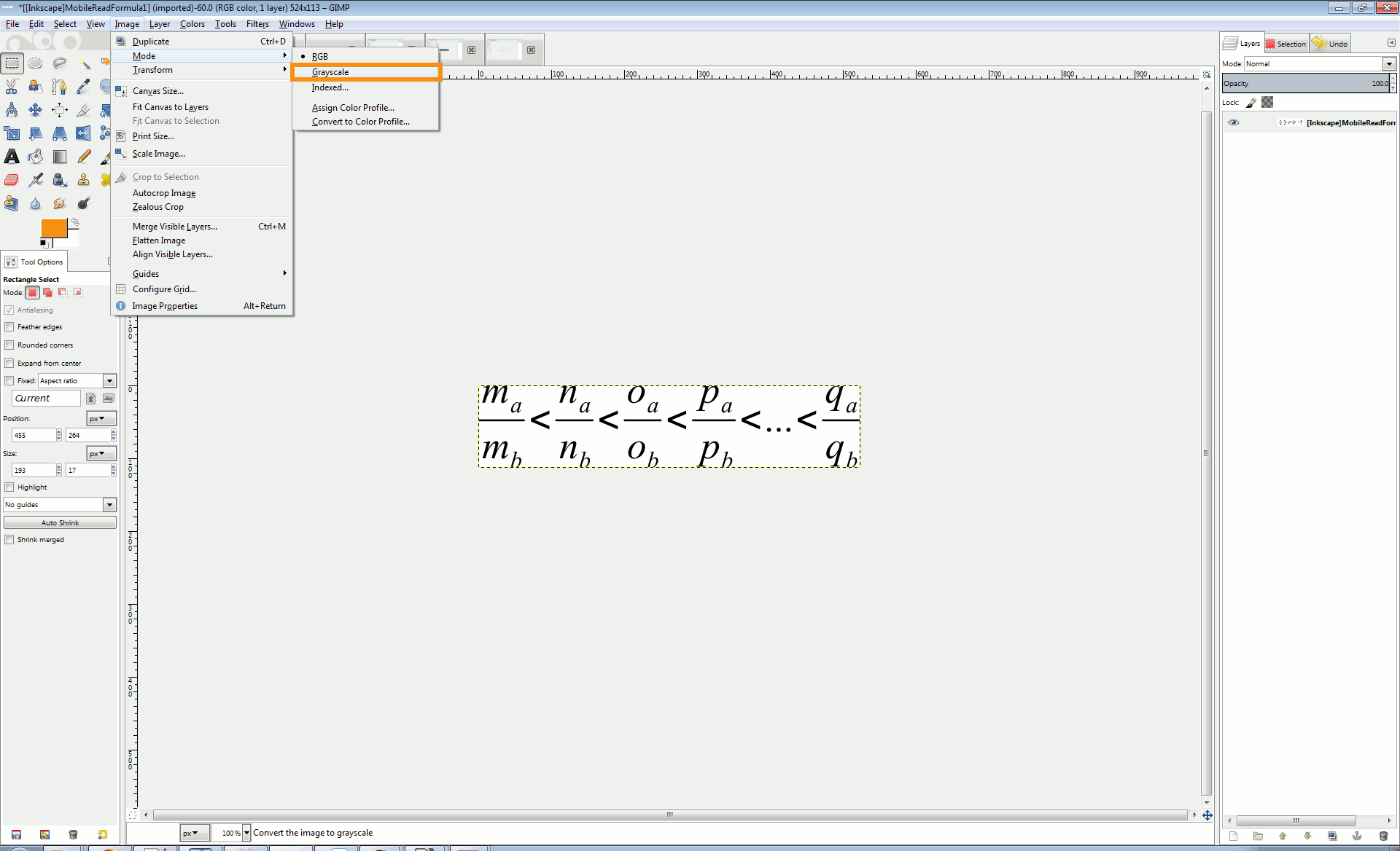 Open GIMP, and open the PNG formulas created from Inkscape.