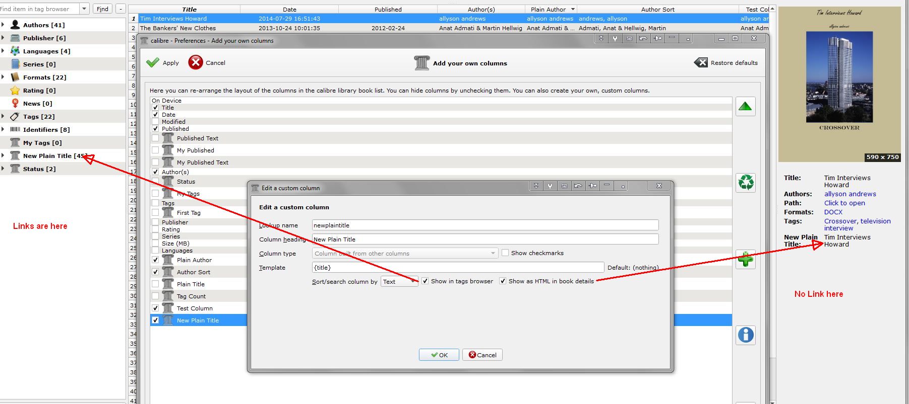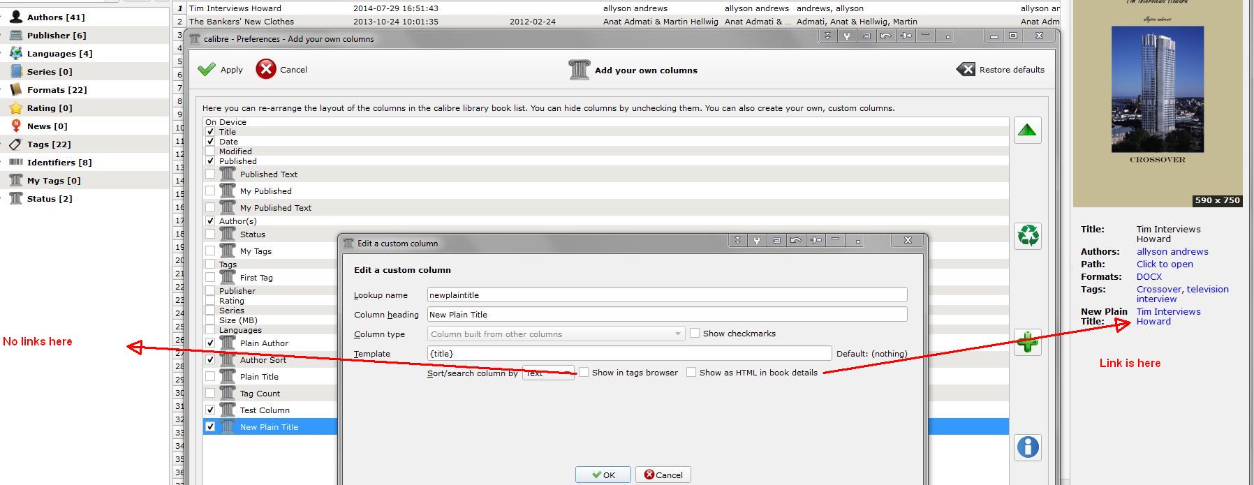 I need to check the column in question in L&F->Book Details to get it to show anything - to me that makes sense too. But to get it displayed as a clickable link to do a search, I have to uncheck