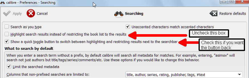 While you are there and if you wish, you can add a button to calibre's search bar to make it easy to switch between the two modes. The above image shows you where to make this change.