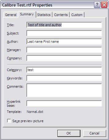 In the document properties, I entered "Test of title and author" in "Title" line and "Last name First name" in the "Author" line. Those are what displayed when I imported the RTF document into Calibre.