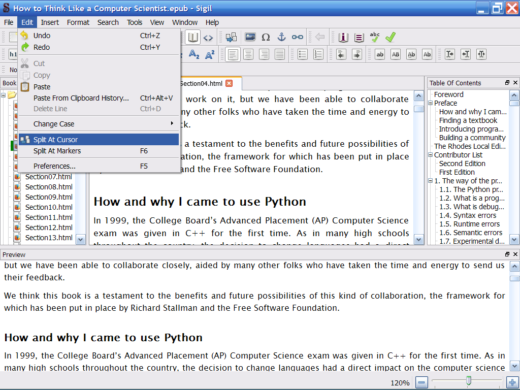 Once you have inserted all split marker you want, press F6 (or go to Edit/Split at Marker). With this last method and a bit of regex you can split an epub very easily. For example if you want to split the epub before any <h2> tag, you only have to S&R with: