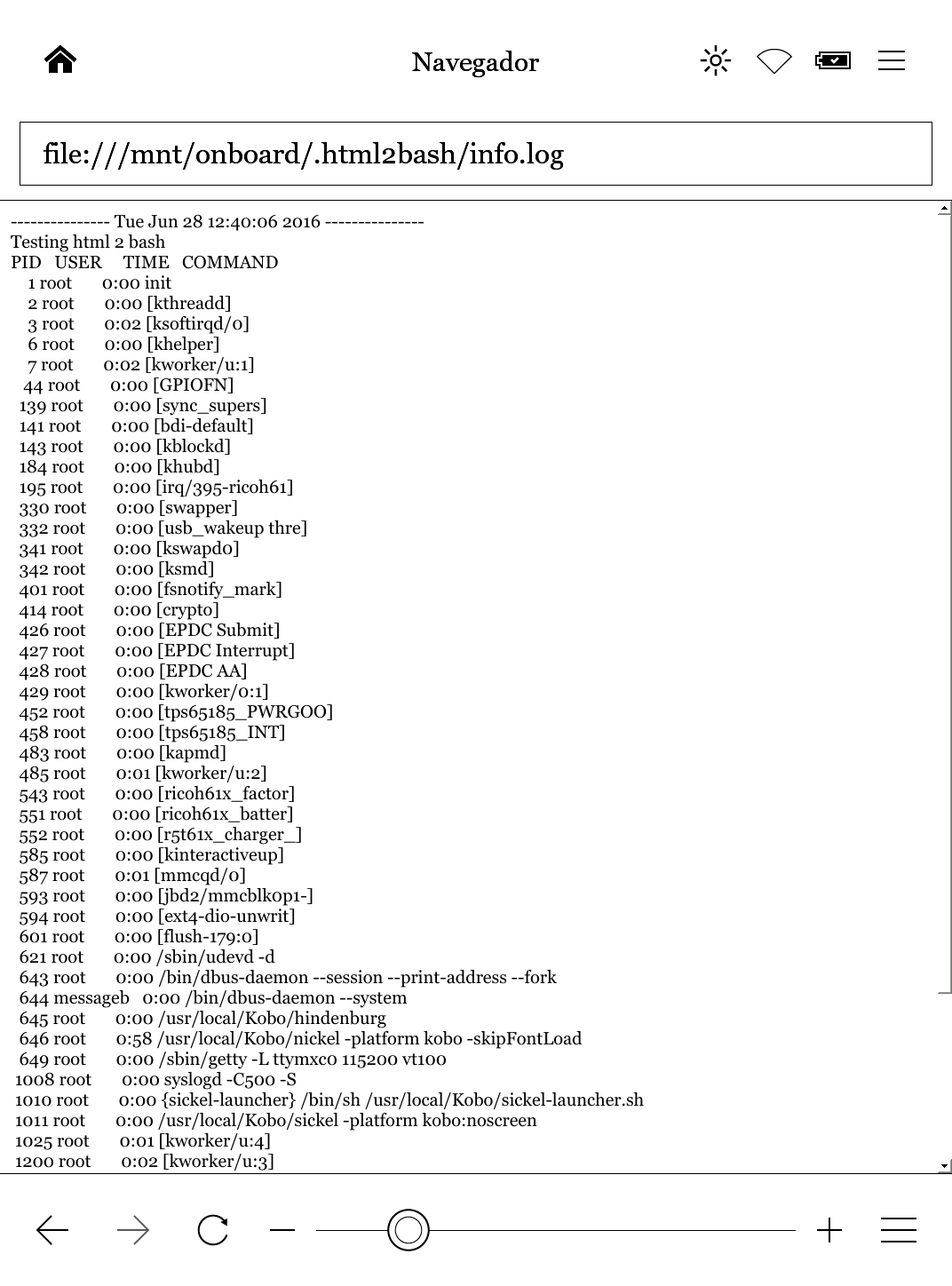 From Kobo browser we can write our commands to run, or load our custom scripts. With some internal javascript tricks, scripts are saved and we can plug usb-charger to force its run and see results.