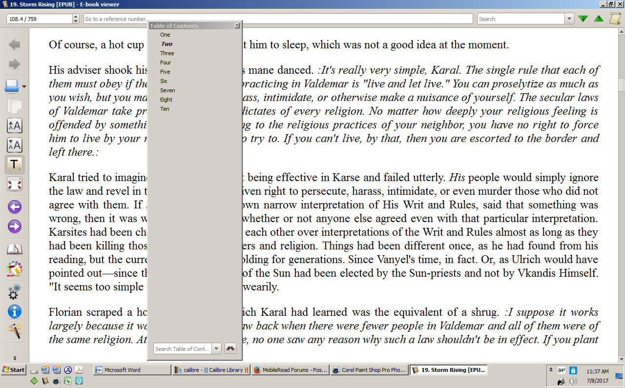 This morning when I opened the ebook Viewer with the last book I was reading the TOC isn't popping up on the left side of the viewer but outside it as a separate window. Does anyone know how I can get the TOC back where it belongs? That separate window annoys the heck out of me when trying to read my book.