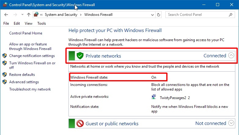 - FAQ step 2.1: Post a screen capture of your Windows 10 firewall settings main screen so we can verify that the windows firewall is on.