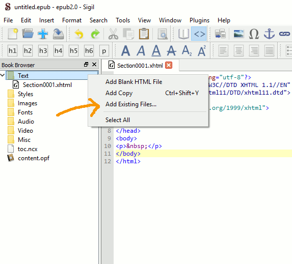 Create a new EPUB, Right-Click in the Book Browser + "Add Existing Files":