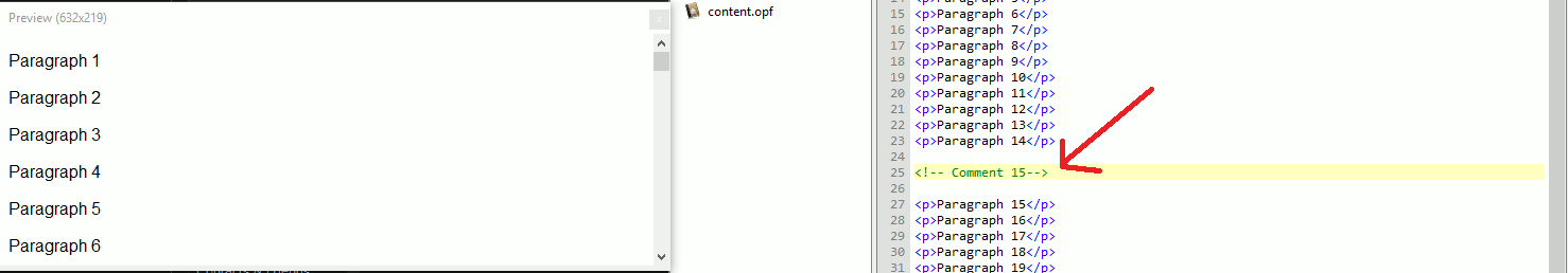 Preview window syncs to each location fine... until you place your cursor on the line With/After the HTML comment on it.