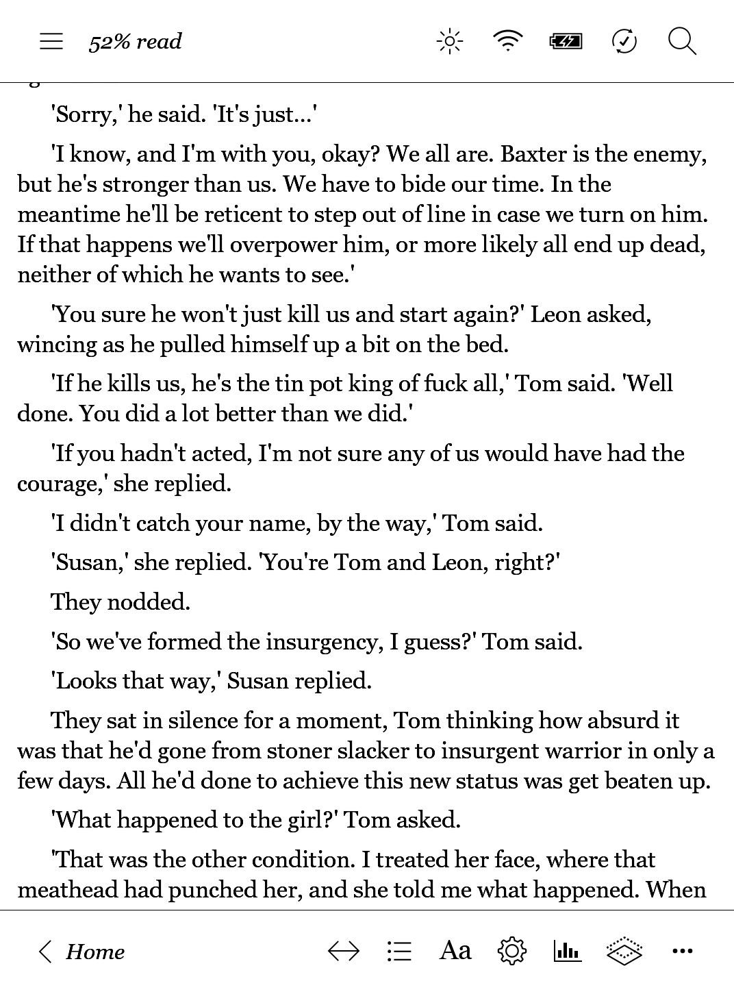 The attached screenshots are from my Clara HD running firmware 4.11.11911. They show the various combinations of the header and footer shown and not show. Plus with the menubars shown to show the differences there. And there is a screenshot with the smallest font to try and fill the text area as much as possible.