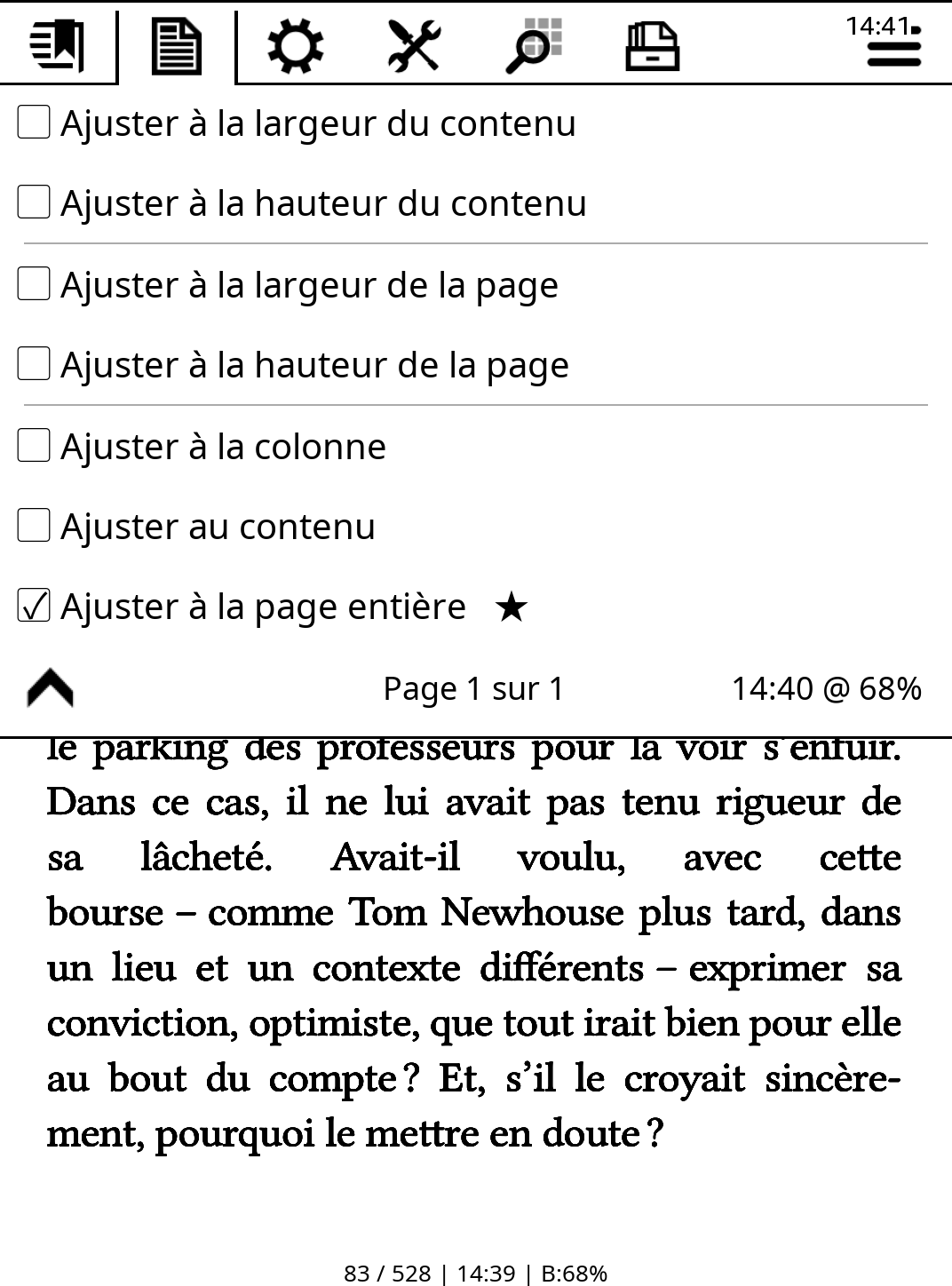Comme le montre la copie d'écran, Koreader permet à l'utilisateur de choisir parmi différents facteurs de zoom.