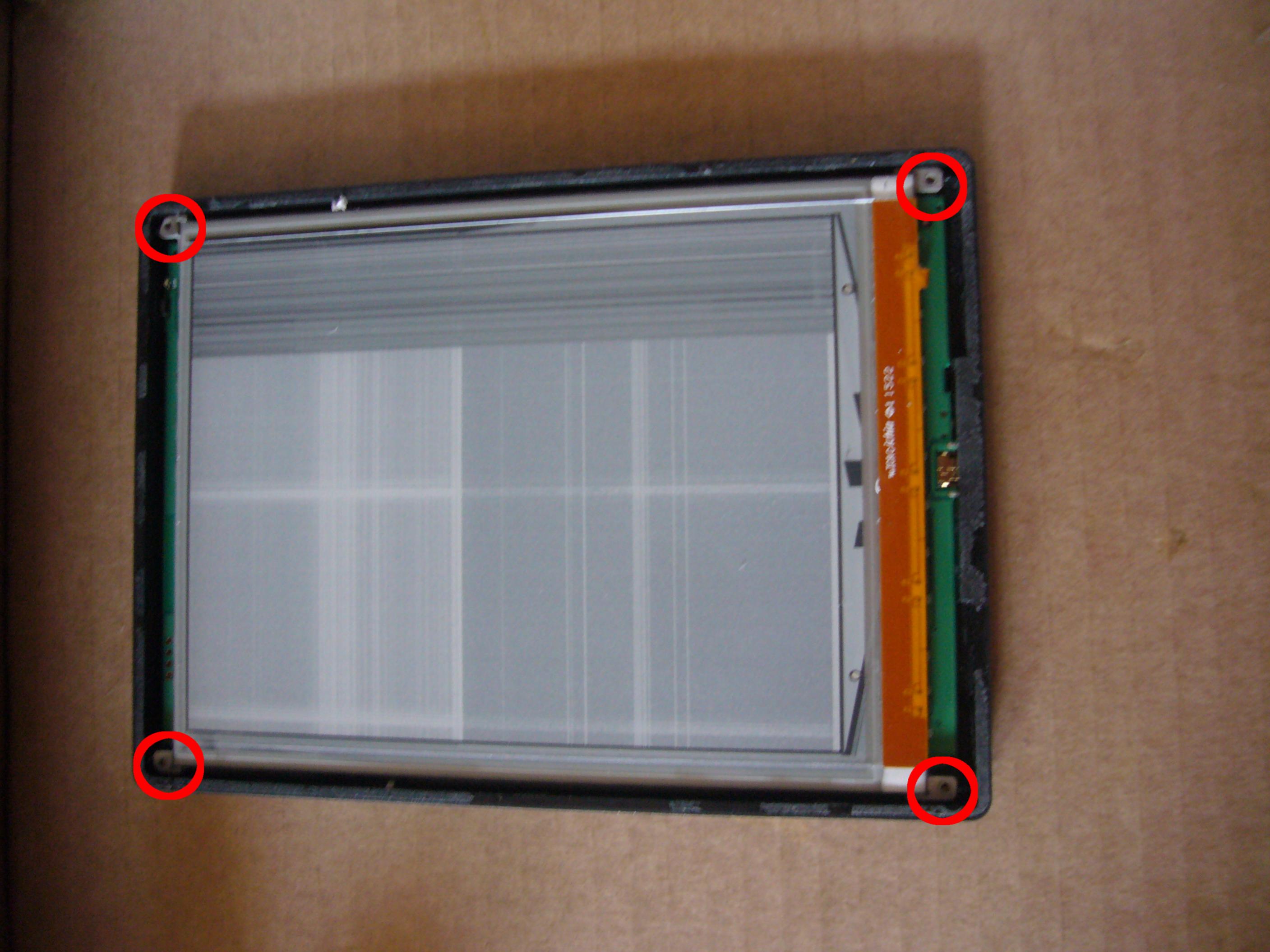 5. Take out the screw in each of the four corners and lift up the screen / pcb assembly. Lift the top first and drag the bottom behind to work your way around the usb connector.