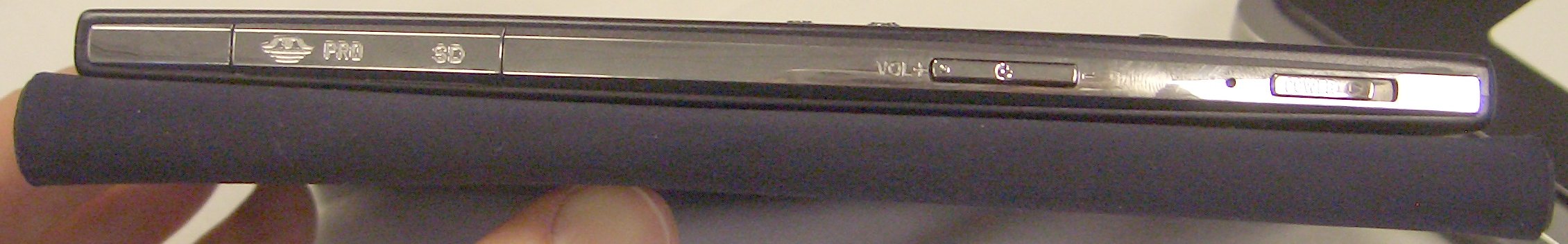 like the PSP’s power supply), which could be handy to know. Next comes the cradle connector which we were told is a combination of the DC charging function and the functions of the mini USB to the left of this connector. At the left end of the bottom is something that I hadn’t expected, but was instantly glad to see: a lanyard attachment point. The Reader doesn’t ship with a lanyard, which struck me as a bit odd, but one shouldn’t be too hard to scare up.