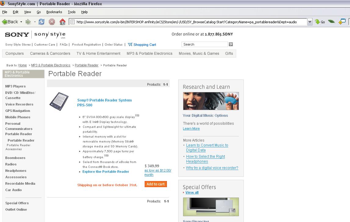 For those who don't like links, the Reader is retailing at $349.99 there. "Shipping on or before October 31st."
