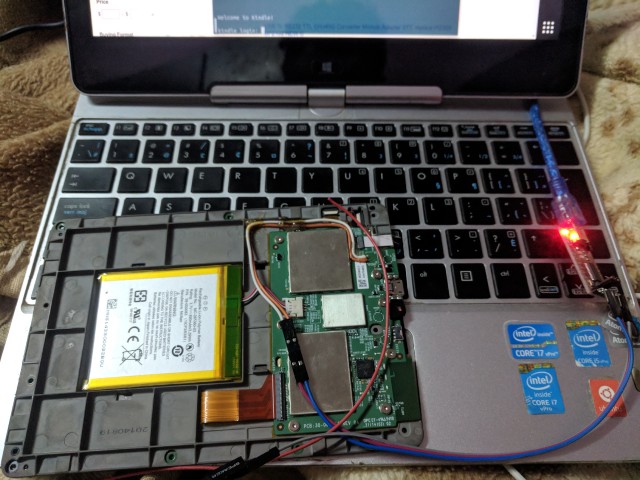 Then, when I need serial access, I would connect Tx and Rx to these two, and ground is from a third, bare-ended jumper cable wrapped around a Kindle motherboard screw.