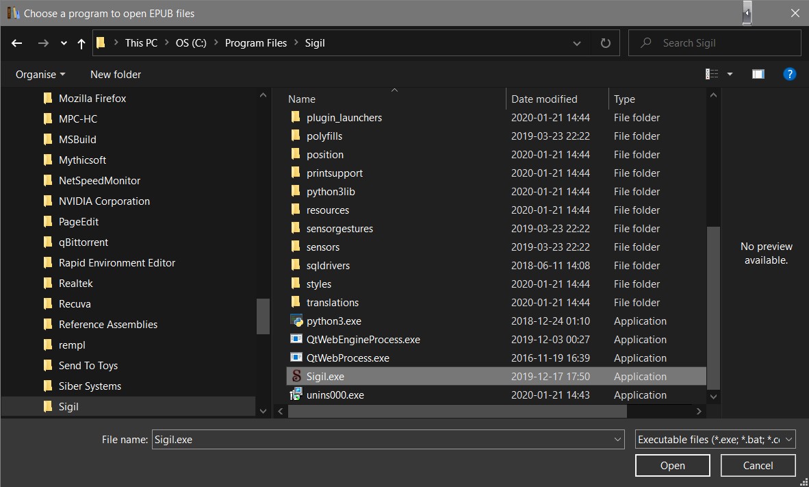 Browse computer for program, which will open up a file manager open file dialogue, browse to the program you want - such as Sigil