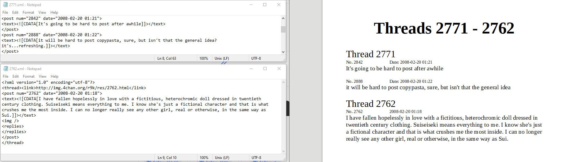 I have a folder filled with 4chan threads, each thread can contain any number of comments. I want to create readable files for my Kindle, with multiple threads per book, with each thread clearly defined for the person reading it, each comment showing details that are present in the .xml file, such as 'date of post', the post number, the comment text, etc.