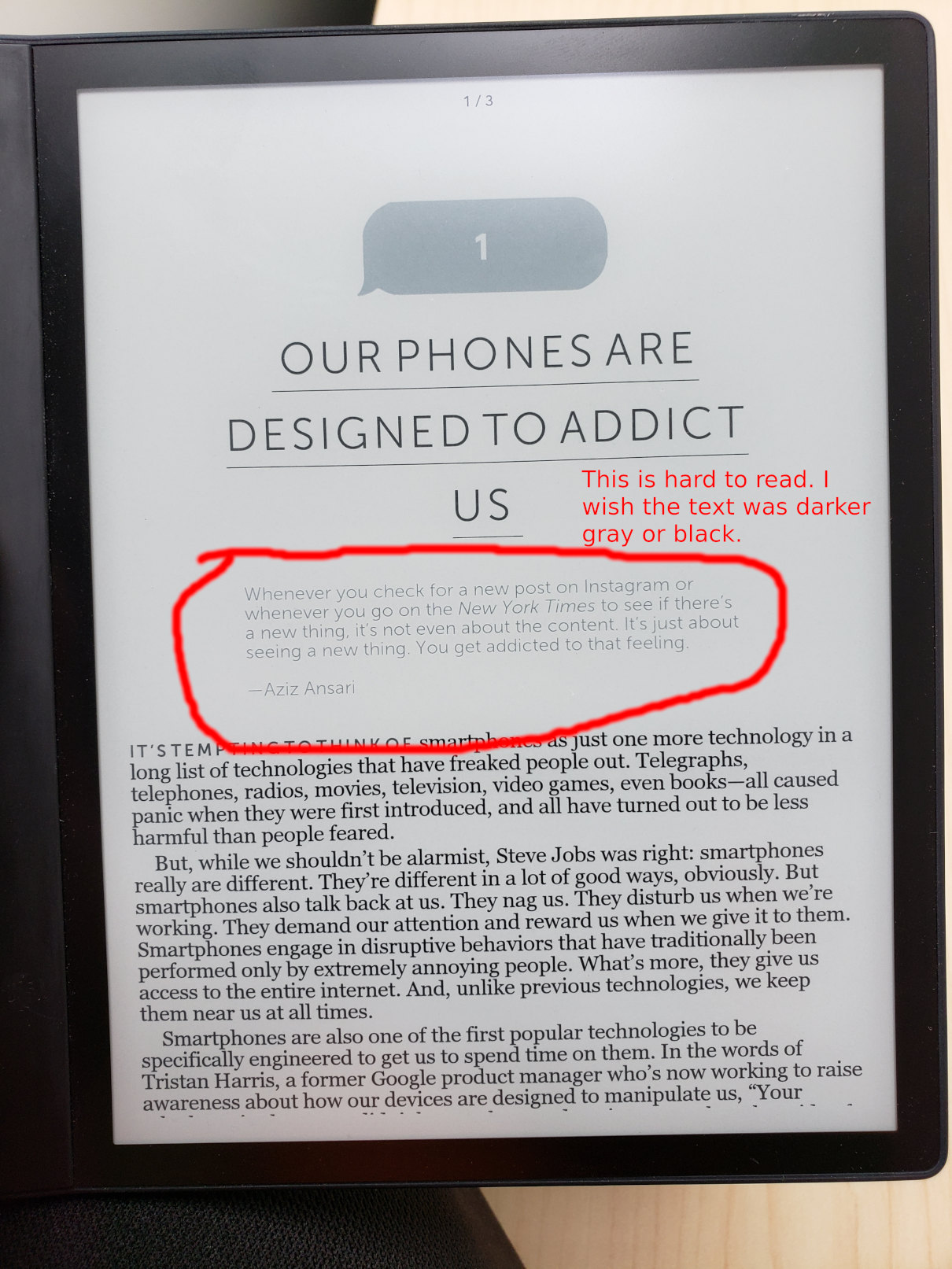 But please see the photo with my green annotation. I'm referring to the Steve Jobs quote in white and a dark gray background. For me, this is okay, as it's easy to read.