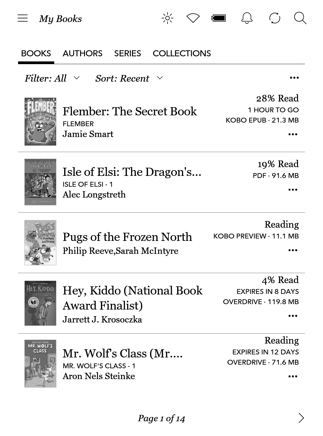 The most obvious change: window title replaced with a clock, and new bottom navigation. You'll also notice a bug here with the Pocket integration, that I've been meaning to report to Kobo for some time, along with other bugs relating to the Pocket integration and previews (samples).