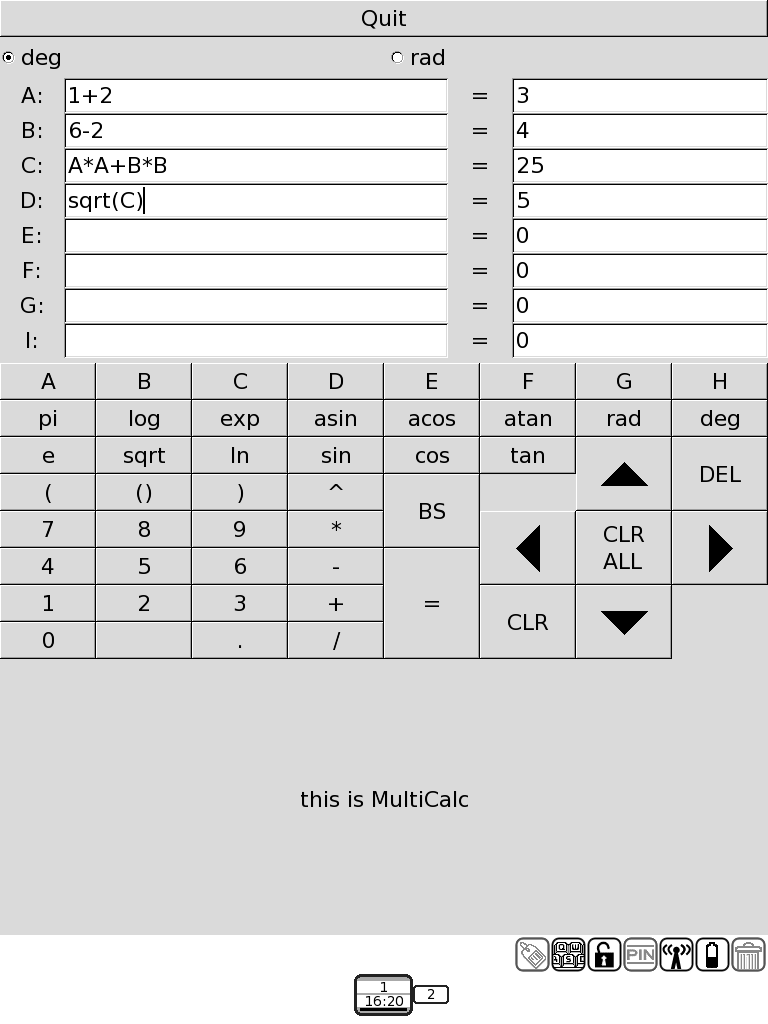 - MultiCalc is also a minimalistic spreadsheet: the results of entry 'A' can be used in a formula in entry 'B' and lower. When you modify an entry, all entries below it are updated. The screen shot demonstrates the idea