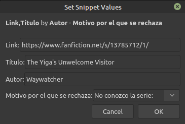 I even used a snippet app that show a form with the attributes url, tittle, author and reason (you can see the form in the attached image). I use a snipped app to complete a form with 4 attributes: url, title, author and reason to generate the sintax. This is fast for a few stories. But no so much with 10 or more.
