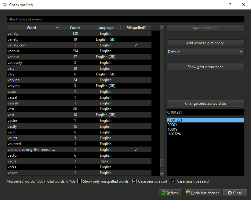 - Spellcheck List's "Count" column