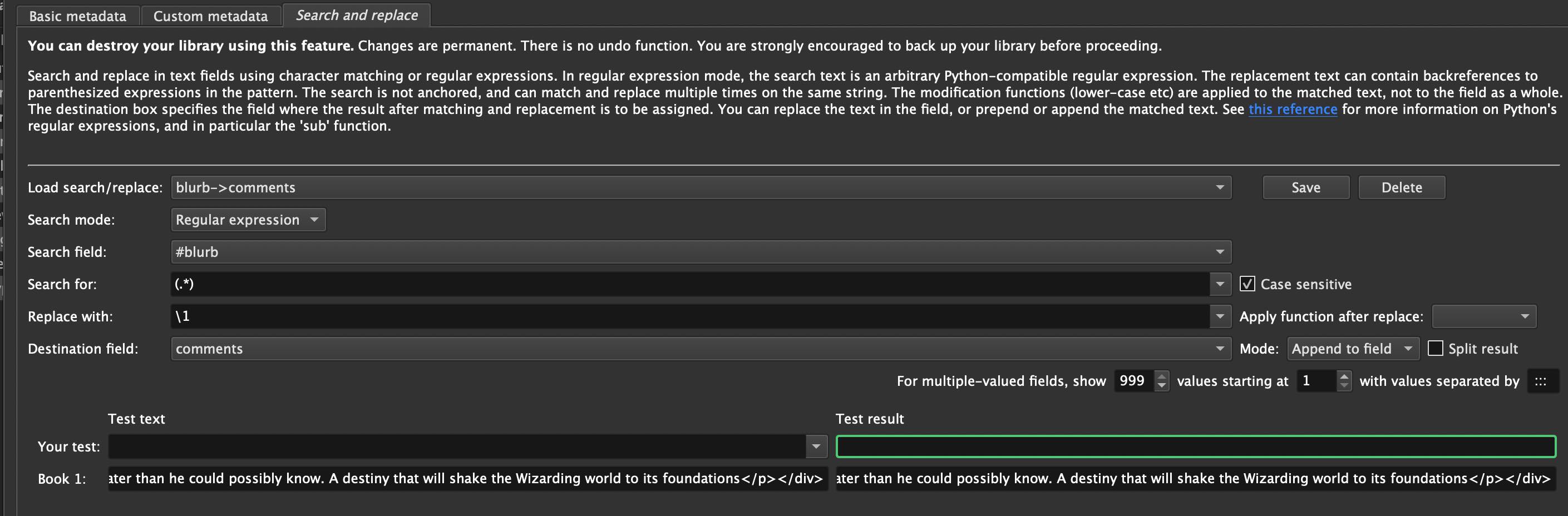 When copying paragraphs of text from #blurb to #comments, Calibre is inserting <br> tags into the html of the text. I have attached 3 images of this issue - the first is the regex being used to copy text and the other 2 show the results (normal view and html view). I am interested in *not* having Calibre insert <br> tags into the copies text.