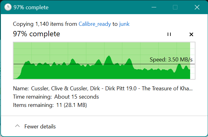 This is a speed graph from a test drag-dropping 1100+ epubs to my Libra2 using Win11 via USB3.
