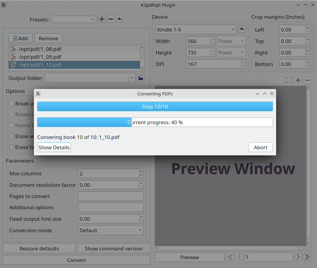 - Stand alone version: Double progress bar to show overall progress as well as each book progress. Also enable abort mid-conversion instead of waiting for the current book to finish.