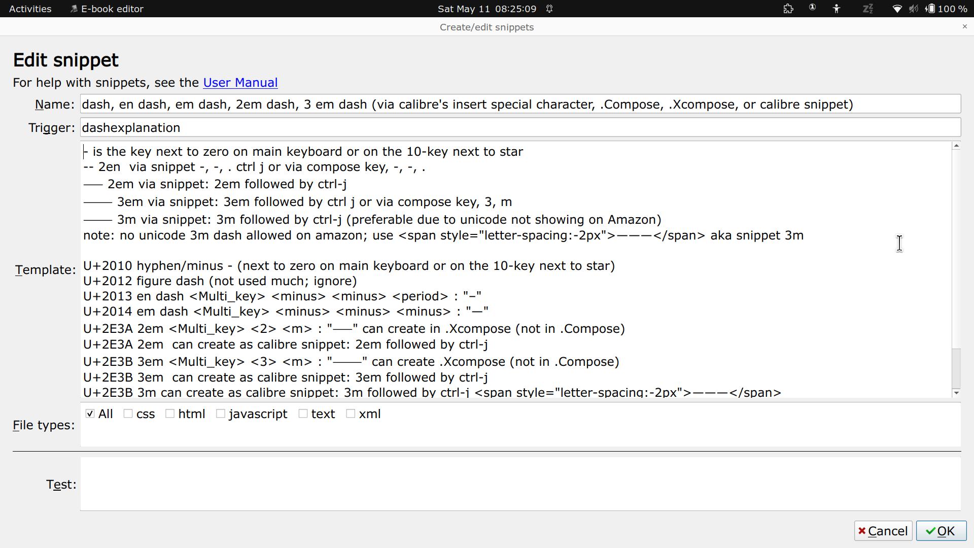 I make all these different kinds of dashes with snippets or .Xcompose. If you are in tag editor you can click 'insert special character' and search for 'dash' to see them all. From there, it is easy to make a calibre snippet. Or, if you prefer, there are .Compose key inputs for some. For the ones missing in .Compose you can make your own in .Xcompose. Best regards, Pop
