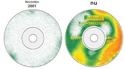 "On the image below you can see the exact same CD-R. On the left you see the outcome of our tests done in 2001. On the right you see the same CD-R in 2003. The colours indicate the severeness of the errors in the following order; white, green, yellow and red whereas white indicates that the disc can be read well and red indicates that it cannot be read."