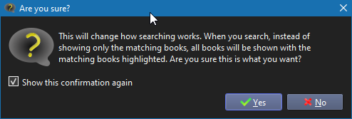 Just jumping in to say that I have had my search selection switch to showing me the entire book list with the selected books highlighted every once in a while. If I click on the highlight/filter button (*) twice, it switches back to showing only the selected books. This has been going for a while but it's erratic so I haven't been able to track down why it is happening. I've checked the Search preferences and the Hightlight search results... checkbox is not checked. The button next to Search shows Highlight—which has always struck me as being backwards though it does show what the search results will switch to if you click the button—so the search results should be filtered to the matching books.