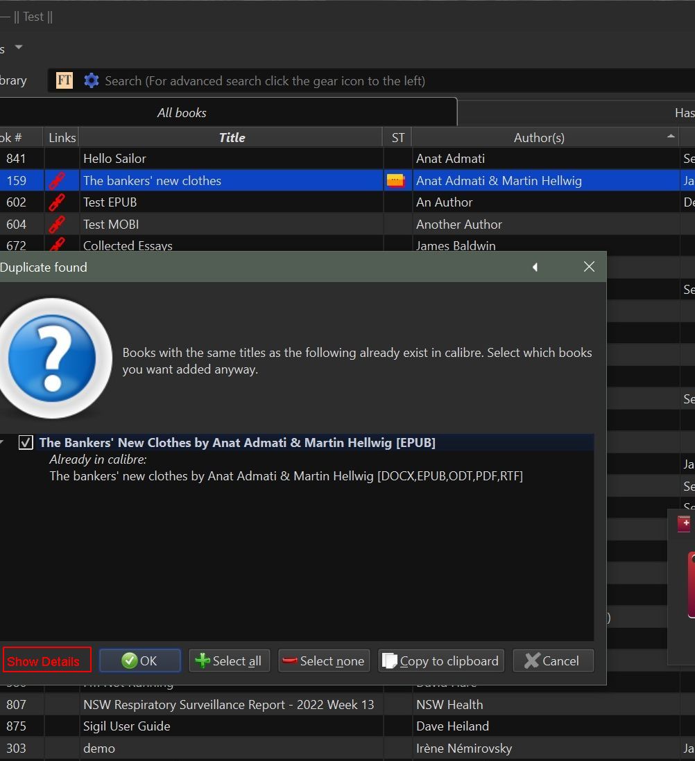 This issue has been raised on several occasions over the years. We now have calibre:// URLs and popup book details so… I was wondering if a "Show Details" button be added to the Duplicate found dialogue, viz: