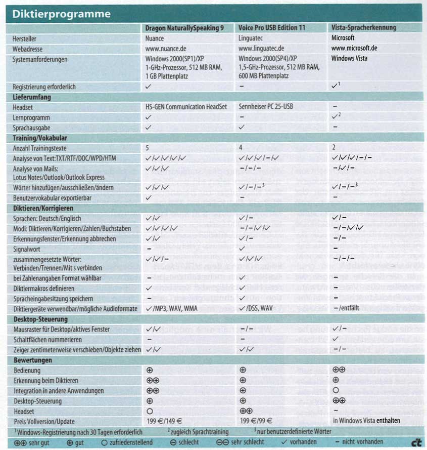 The latest C't (German computer magazine) compares Vista's built-in voice recognition to commercial alternatives... and Vista does surprisingly well! See attached comparison matrix (in German, sorry).