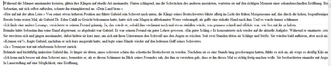<p>Während*die*Männer*umeinander*kreisten,*glitten *ihre*Klingen*auf*rituelle*Art*aneinander.*Finten* schlagend,*um*die*Schwächen*des*anderen*auszuloten ,*warteten*sie*auf*den*richtigen*Moment*einer*seku ndenschnellen*Eröffnung.*Bei*diesem*Sport,*der*sow ohl*Stärke*als*auch*Geschicklichkeit*verlangte,*wa r*Gabriel*leicht*im*Vorteil.*Absichtlich*brachte*e r*sich*selbst*aus*dem*Gleichgewicht,*um*seinen*Geg ner*zu*täuschen,*was*er*beinahe*sofort*bereute*und *einen*Fluch*unterdrückte,*während*er*dem*blitzsch nellen*Gegenstoß*Sebastian*Tremaynes*auswich.*</p>